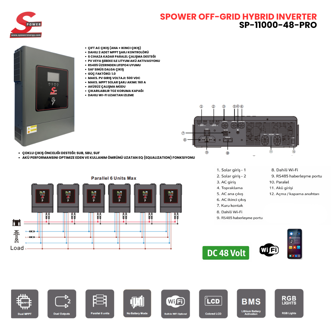 Dahili çift MPPT şarj kontrolcüsü, güneş panellerinden maksimum verim elde edilmesini sağlar. Aküsüz çalışma (No Battery Mode) desteği ile yalnızca güneş enerjisi kullanılarak da çalışabilir. Paralel bağlantı özelliği sayesinde sistem kapasitesi artırılabilir ve daha büyük güç ihtiyaçları için ideal bir çözüm sunar.