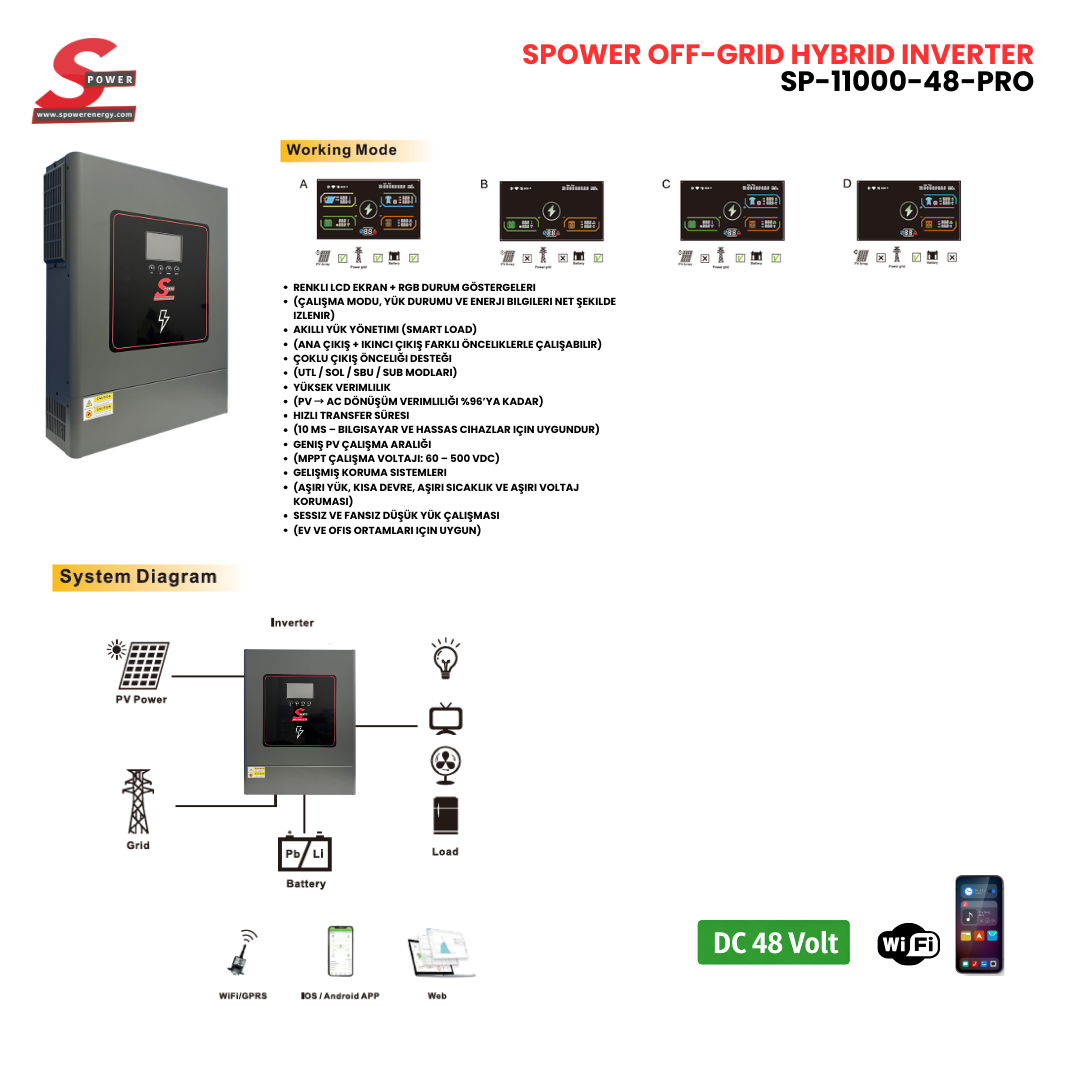 SP-11000-PRO, yüksek güç gerektiren evsel ve ticari güneş enerji sistemleri için geliştirilmiş, çift MPPT’li ve profesyonel bir solar inverterdir. Saf sinüs dalga çıkışı ve güç faktörü 1.0 sayesinde hassas elektronik cihazlar ve yüksek kapasiteli yüklerle kararlı şekilde çalışır.