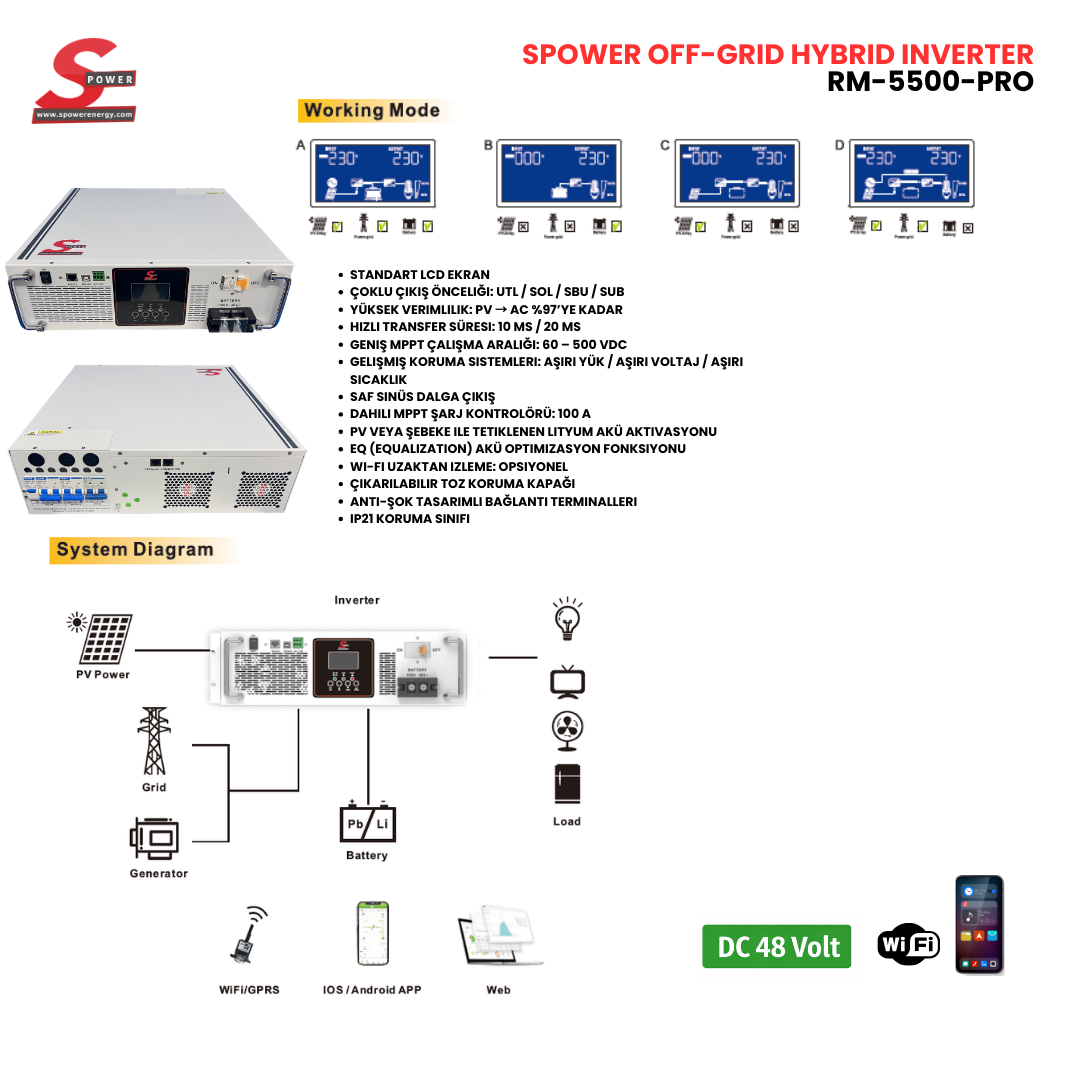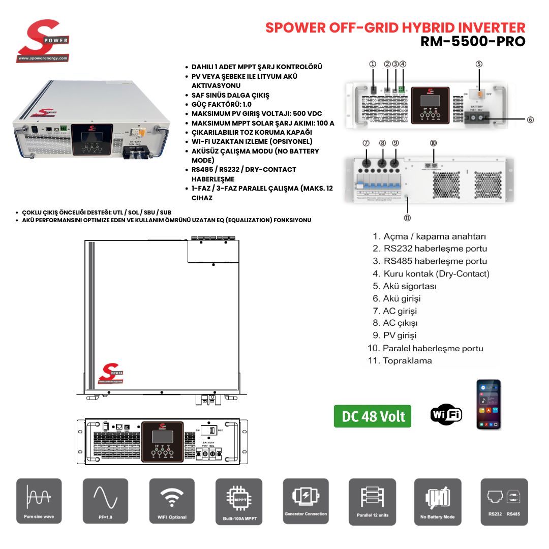 SP-RM5500 PRO, rack tipi (kabinet uyumlu) tasarımıyla profesyonel enerji sistemleri için geliştirilmiş, yüksek performanslı bir solar smart inverterdir. Saf sinüs dalga çıkışı ve güç faktörü 1.0 sayesinde hassas elektronik cihazlar ve yüksek güç gerektiren yüklerle kararlı ve verimli şekilde çalışır.
