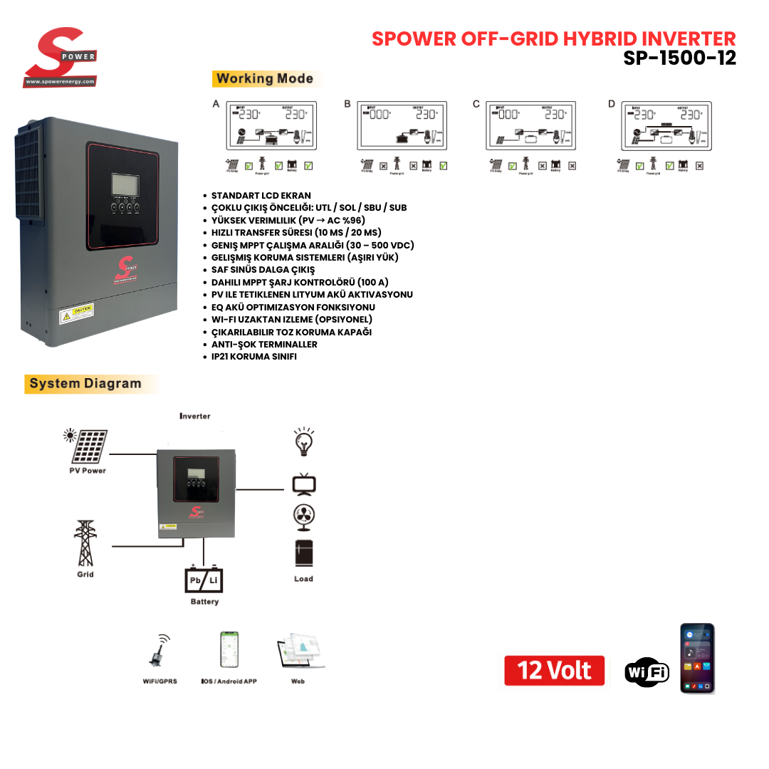 SP-1500-12, ev tipi ve küçük ölçekli güneş enerji sistemleri için tasarlanmış, tek fazlı, MPPT şarj kontrolcülü bir solar inverterdir. Saf sinüs dalga çıkışı sayesinde bilgisayar, televizyon ve hassas elektronik cihazlarla güvenli şekilde çalışır.