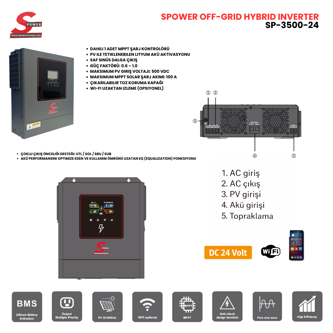 SP-3500-24, ev tipi ve orta ölçekli güneş enerji sistemleri için tasarlanmış yüksek verimli bir solar inverterdir. Saf sinüs dalga çıkışı sayesinde hassas elektronik cihazlarla güvenli şekilde çalışır.