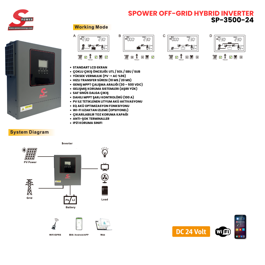 Dahili MPPT şarj kontrolcüsü, güneş panellerinden maksimum verim alınmasını sağlarken, 500Vdc PV giriş desteği esnek panel kurulumu sunar. 24V akü sistemi ile uyumlu olan inverter, şebeke–güneş–akü arasında otomatik geçiş yapar. Opsiyonel WiFi uzaktan izleme özelliği ile sistem durumu kolayca takip edilebilir.