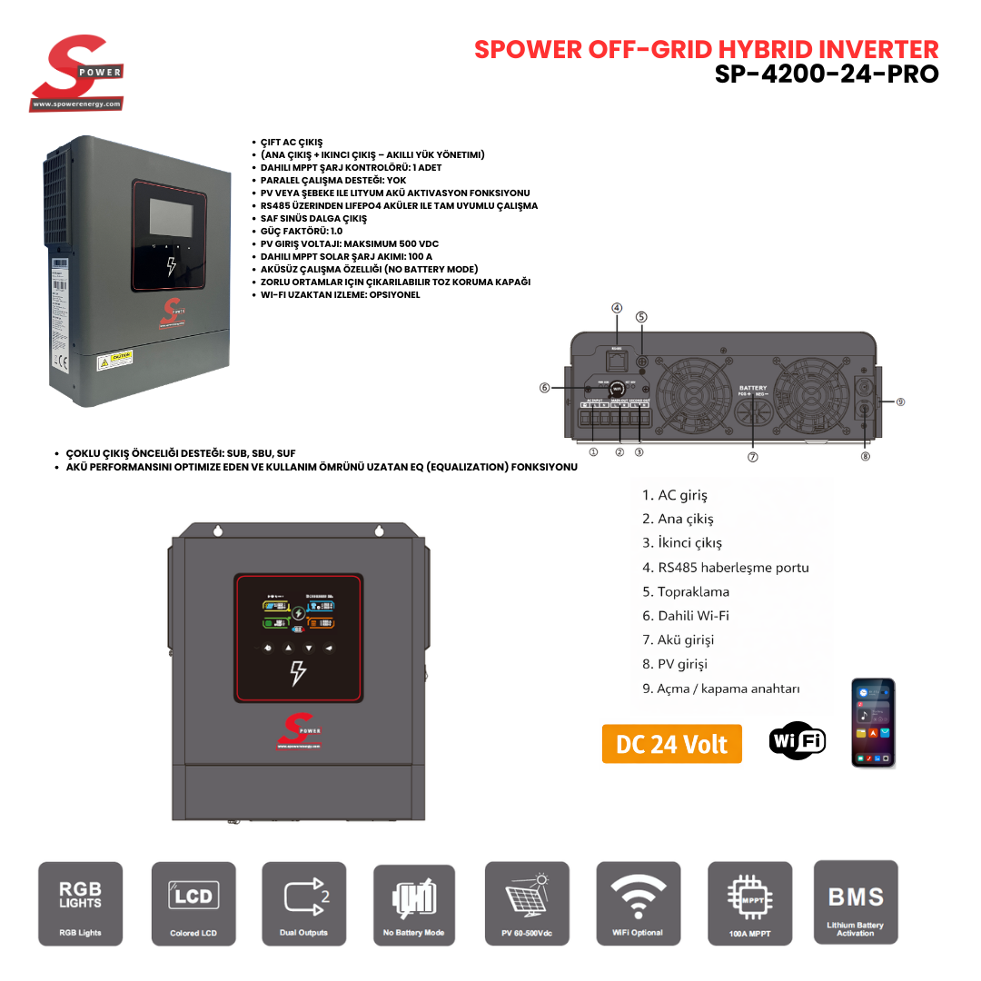 SP-4200-24 PRO, ev tipi ve orta ölçekli güneş enerji sistemleri için geliştirilmiş, çift AC çıkışlı ve yüksek verimli bir solar inverterdir. Saf sinüs dalga çıkışı sayesinde hassas elektronik cihazlarla güvenli şekilde çalışır. Dahili MPPT şarj kontrolcüsü ile güneş panellerinden maksimum verim alınmasını sağlar ve aküsüz çalışma (No Battery Mode) desteği sunar.